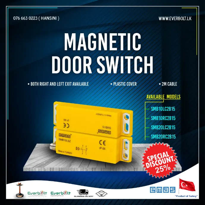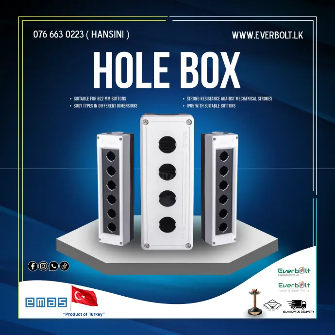 Everbolt Engineering (Pvt) Ltd is the authorized representative of EMAS in Sri Lanka, delivering reliable and high-quality industrial control solutions. EMAS is a globally recognized manufacturer of industrial push buttons, switches, signaling devices, and control accessories, known for their durability, safety, and robust design. With a strong commitment to quality and innovation, EMAS products ensure dependable and efficient control across various sectors, including manufacturing, logistics, and process automation. Partner with us to enhance operational safety, reliability, and productivity with EMAS industrial control technology.